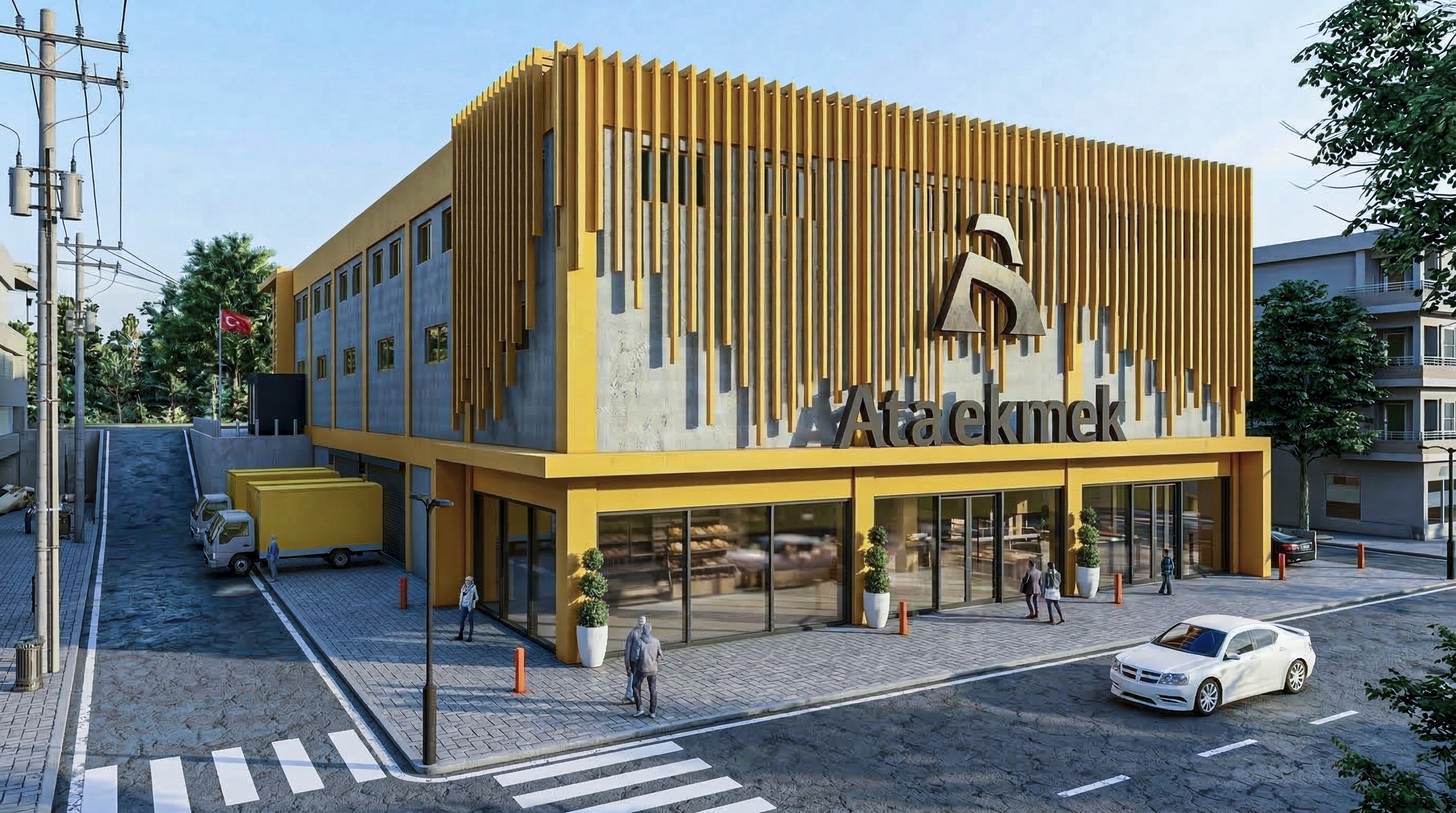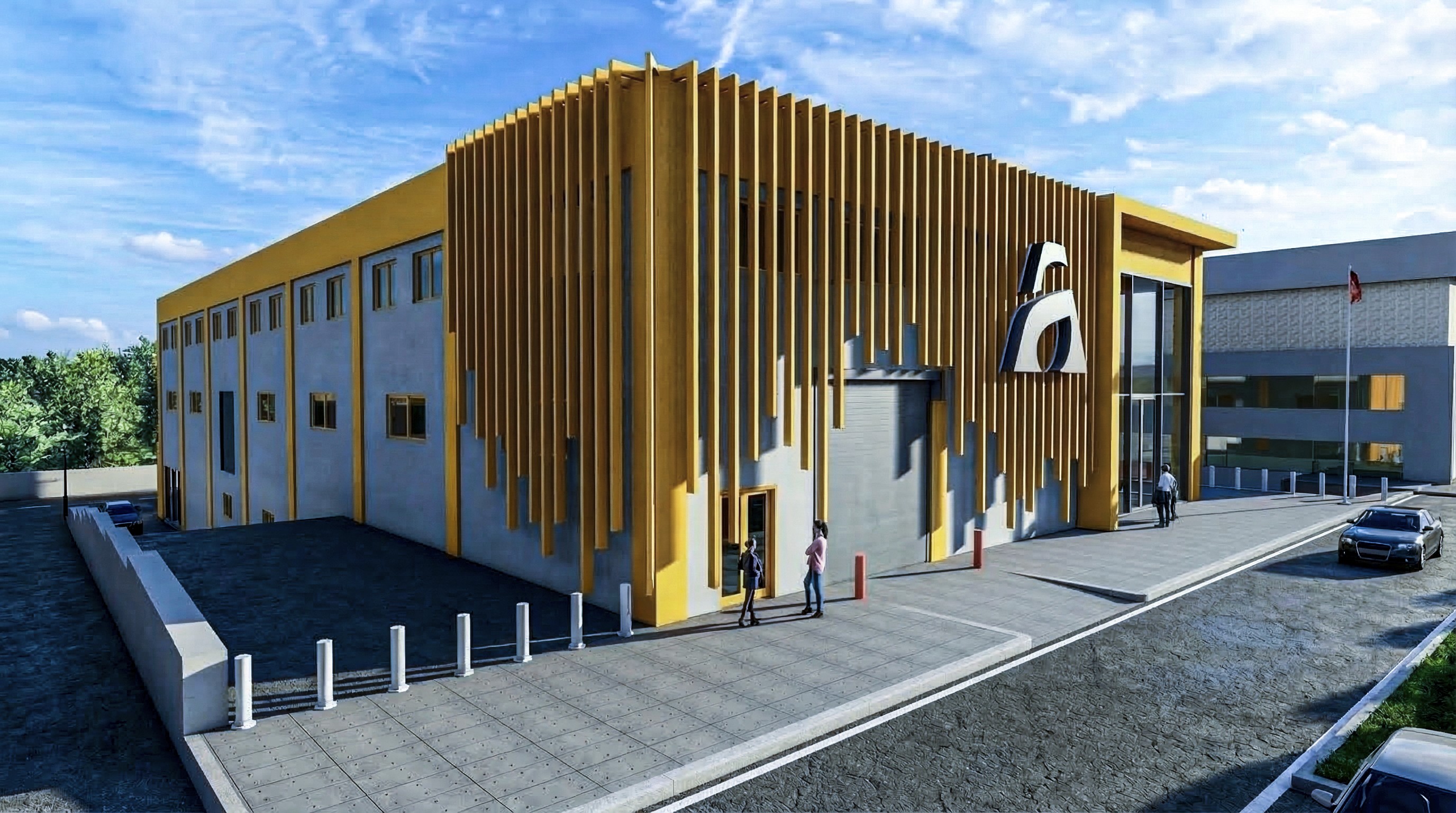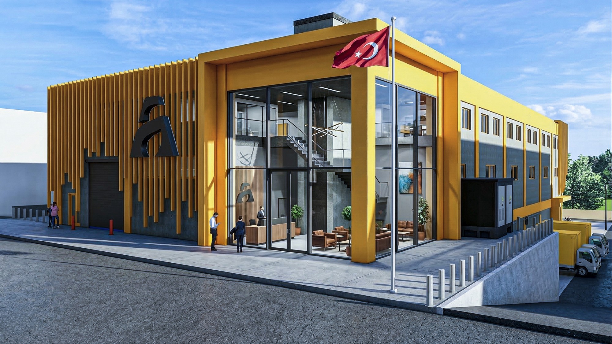 Yapının dış cephesinde kullanılan dikey güneş kırıcı elemanlar, hem estetik bir kimlik oluşturmakta hem de doğal ışık kontrolünü sağlayarak enerji verimliliğine katkıda bulunmaktadır. Güçlü sarı tonlarıyla vurgulanan cephe tasarımı, markanın dinamik ve dikkat çekici karakterini mimariye yansıtmaktadır. Geniş cam yüzeylerle tasarlanan giriş bölümü, şeffaflık ve davetkârlık hissi oluştururken, iç mekân ile dış mekân arasında güçlü bir görsel ilişki kurulmasını sağlamaktadır. İç mekânda yer alan ofis ve karşılama alanları, kullanıcı konforu ve işlevsellik göz önünde bulundurularak planlanmıştır. Proje kapsamında, üretim alanları, lojistik erişim noktaları ve idari bölümler arasında optimum bir akış sağlanmış; böylece operasyonel verimlilik artırılmıştır. Araç giriş-çıkışları ve yükleme alanları, fonksiyonel ve düzenli bir şekilde organize edilmiştir. Bu proje, endüstriyel bir yapının yalnızca üretim odaklı değil, aynı zamanda marka değerini yansıtan bir mimari kimliğe sahip olabileceğinin güçlü bir örneğidir.